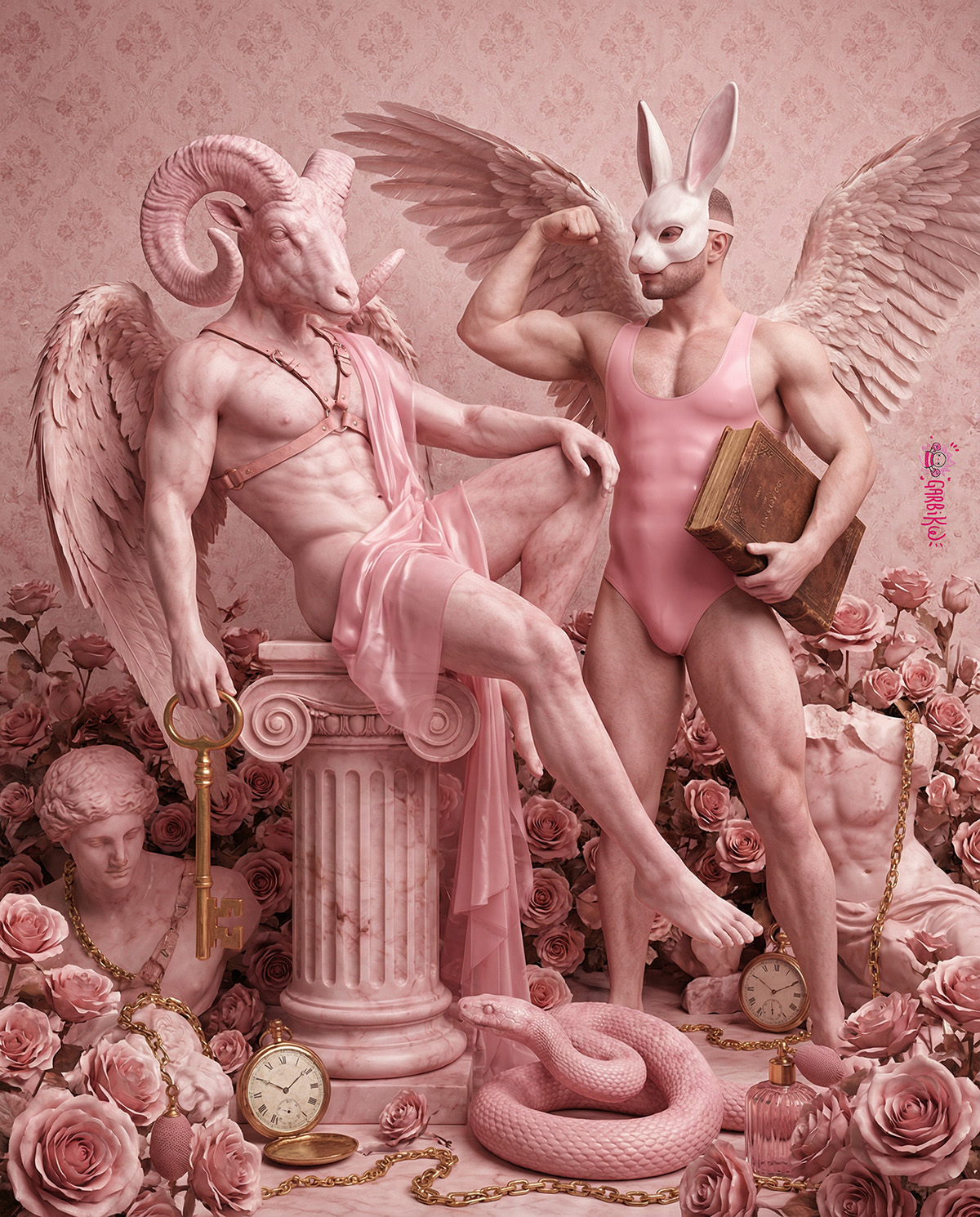 Hay una serie de imágenes que vuelven una y otra vez en mi trabajo: ángeles, corazones atravesados, cuerpos masculinos casi escultóricos, flores que parecen sacadas de un altar, columnas, iconografía religiosa mezclada con colores artificiales o gestos kitsch. No es algo programado. Más bien es un clima visual que reaparece con naturalidad cuando construyo imágenes.